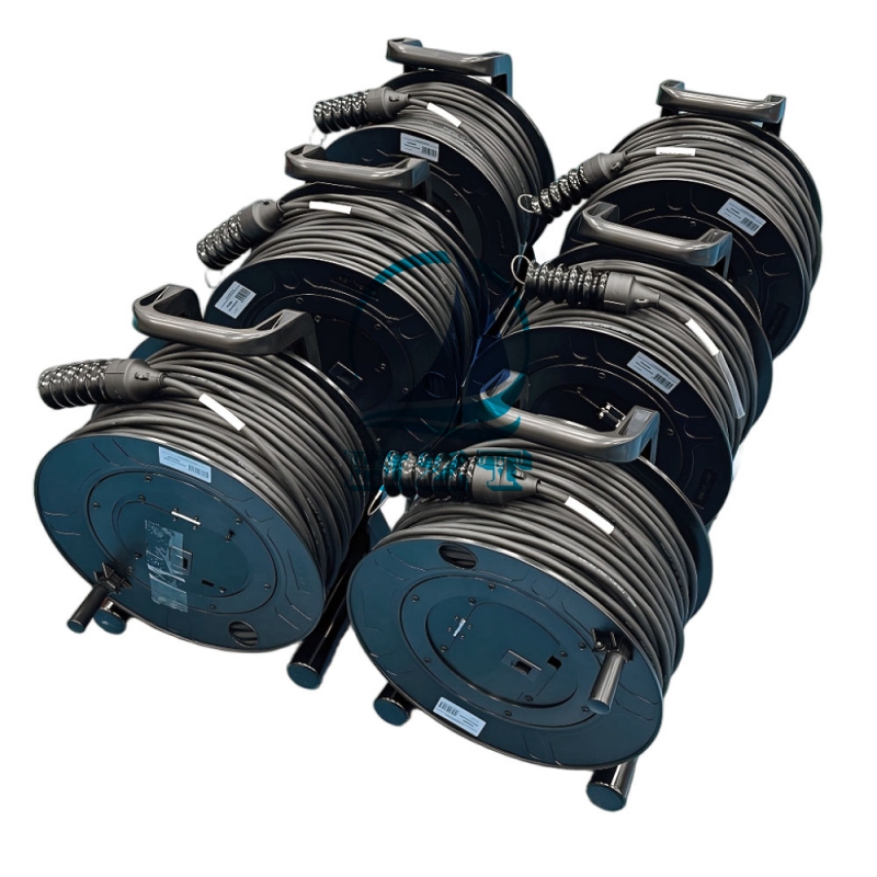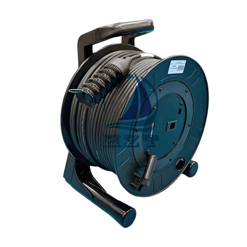 This product is a professional-grade SMPTE 311M-compliant hybrid camera fiber optic cable assembly, conveniently supplied on a durable, high-strength plastic cable drum. The assembly integrates the standardized FUW-PUW (Fiber Utility Wedge - Power Utility Wedge) hybrid connector system, designed for broadcast camera applications.The core of this solution is the SMPTE 311M cable itself, engineered to transmit high-bandwidth video/audio/data signals and provide camera power and control over a single, lightweight fiber. It ensures reliable performance for live production, outside broadcasting (OB), and studio environments.A key feature is its packaging. The cable is neatly wound onto a robust, high-strength plastic cable drum with a maximum capacity of 100 meters. This drum is specifically designed for easy transportation, deployment, and storage in demanding field conditions. It protects the cable from tangles and damage while allowing for smooth pay-out and reel-in during setup and wrap-up.This cable assembly is the ideal solution for broadcast engineers and technicians requiring a reliable, pre-tested, and portable fiber link for connecting cameras to base stations up to 100 meters away.