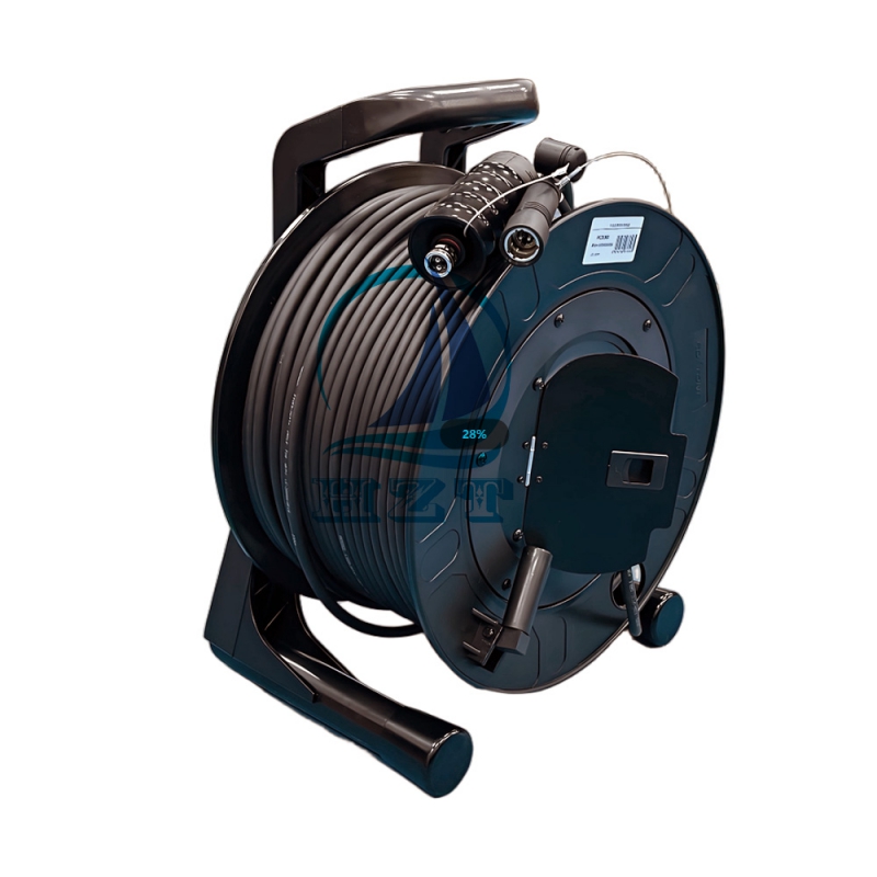 This product is a professional-grade SMPTE 311M-compliant hybrid camera fiber optic cable assembly, conveniently supplied on a durable, high-strength plastic cable drum. The assembly integrates the standardized FUW-PUW (Fiber Utility Wedge - Power Utility Wedge) hybrid connector system, designed for broadcast camera applications.The core of this solution is the SMPTE 311M cable itself, engineered to transmit high-bandwidth video/audio/data signals and provide camera power and control over a single, lightweight fiber. It ensures reliable performance for live production, outside broadcasting (OB), and studio environments.A key feature is its packaging. The cable is neatly wound onto a robust, high-strength plastic cable drum with a maximum capacity of 100 meters. This drum is specifically designed for easy transportation, deployment, and storage in demanding field conditions. It protects the cable from tangles and damage while allowing for smooth pay-out and reel-in during setup and wrap-up.This cable assembly is the ideal solution for broadcast engineers and technicians requiring a reliable, pre-tested, and portable fiber link for connecting cameras to base stations up to 100 meters away.